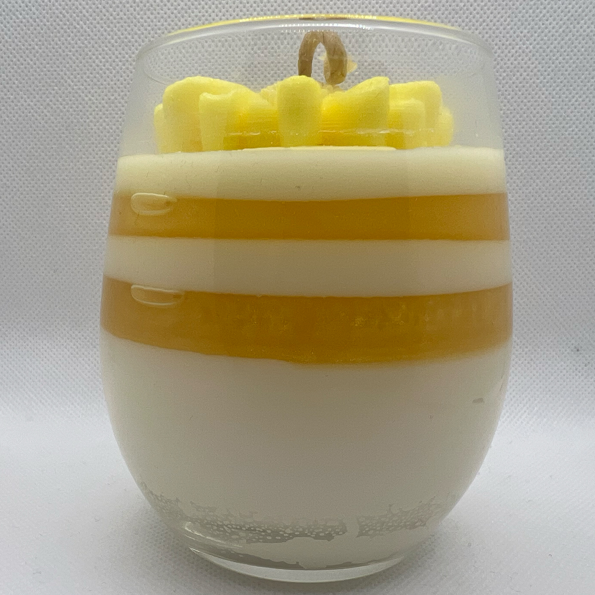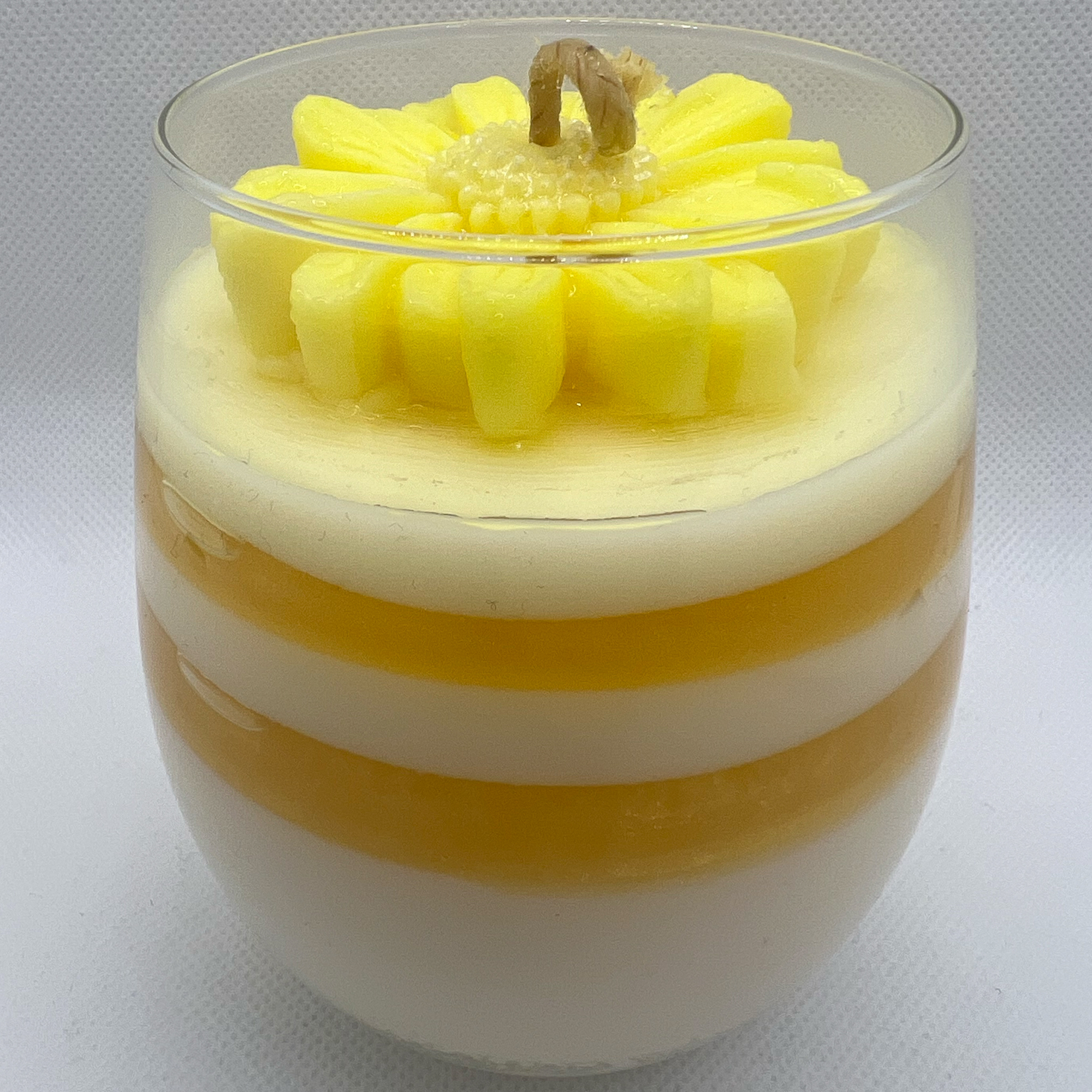 The “Blooming Daisy” scented candle is a vibrant expression of freshness and optimism, inspired by the delicate beauty of daisies. Its design features layers of soy wax in shades of yellow and white, evoking the warm sunlight and soft petals of daisies. Decorated with a handcrafted yellow flower, this soy wax candle adds a charming decorative touch.