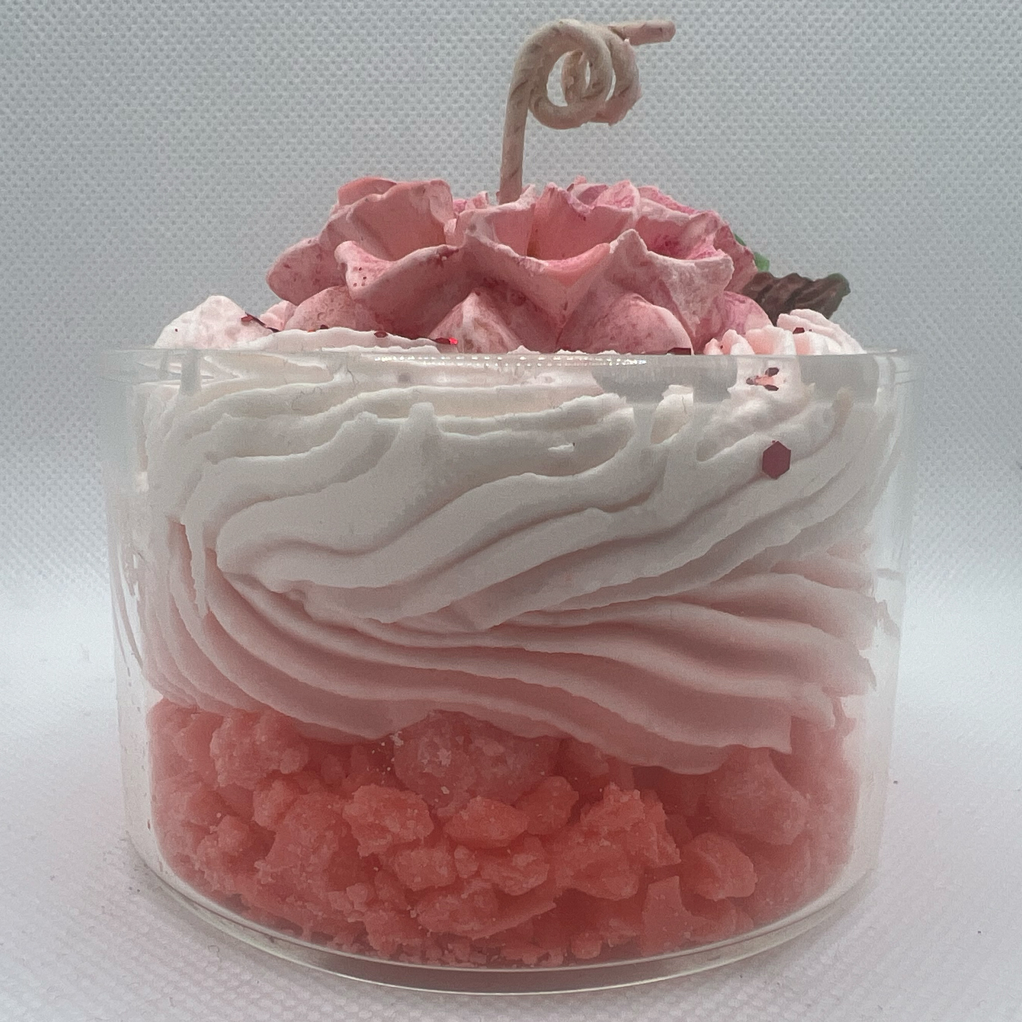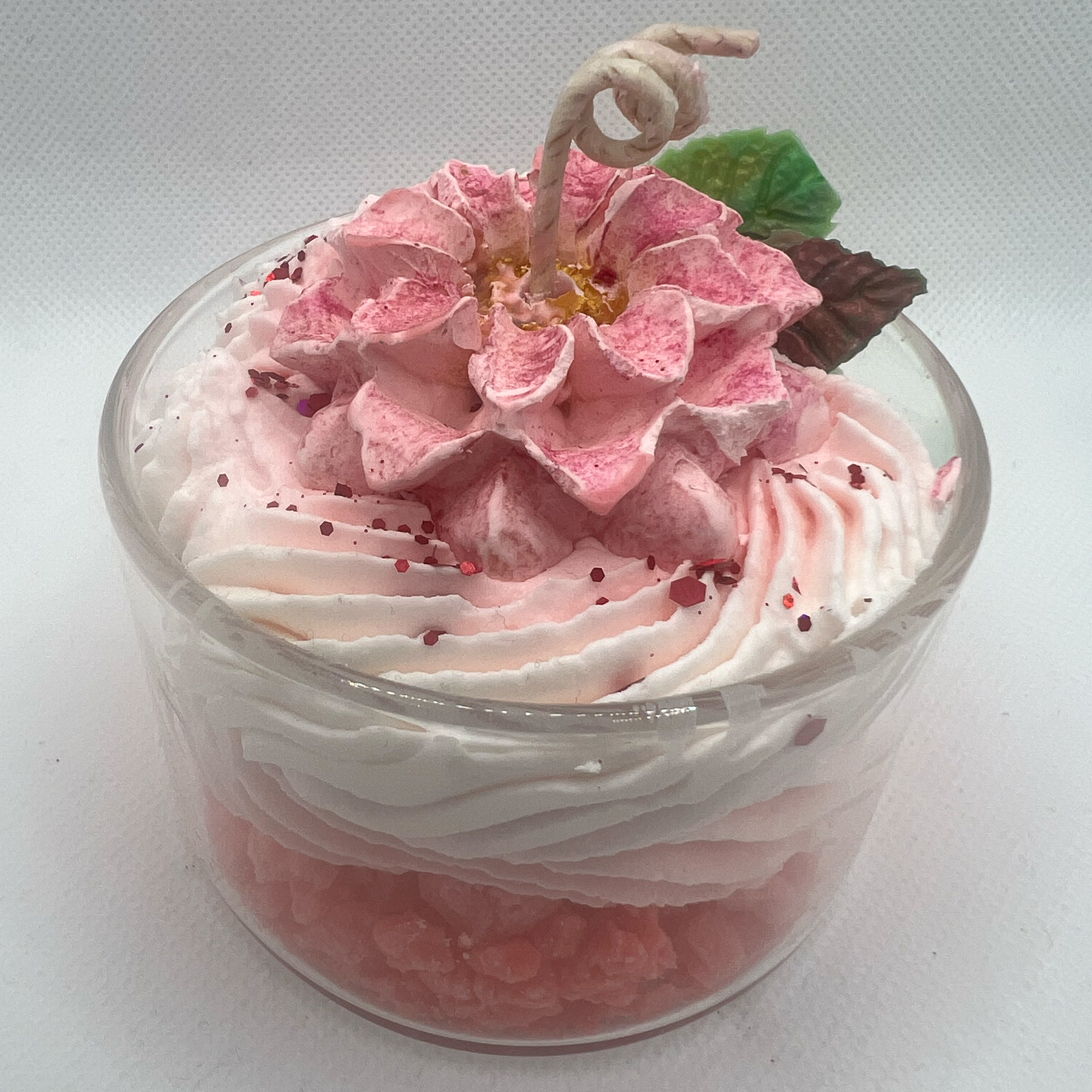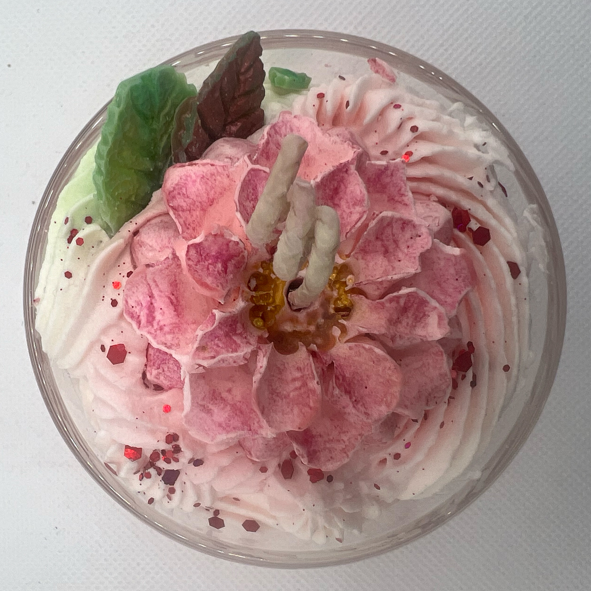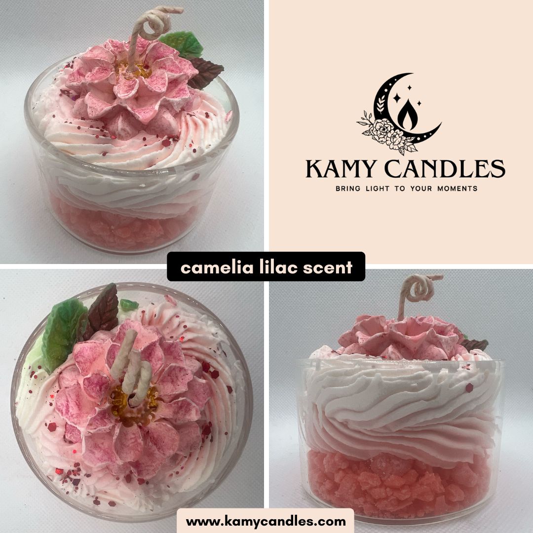 The “Camelia Dreams” scented candle is a unique and delicate creation inspired by the natural beauty of the camellia flower. With a sophisticated design, the candle features an elegant décor of soft pink petals, green leaf details, and dewy accents. Encased in a transparent container, it showcases a layered look with a base of decorative pink crystals that beautifully contrast the creamy white soy wax sculpted to resemble a freshly bloomed flower.